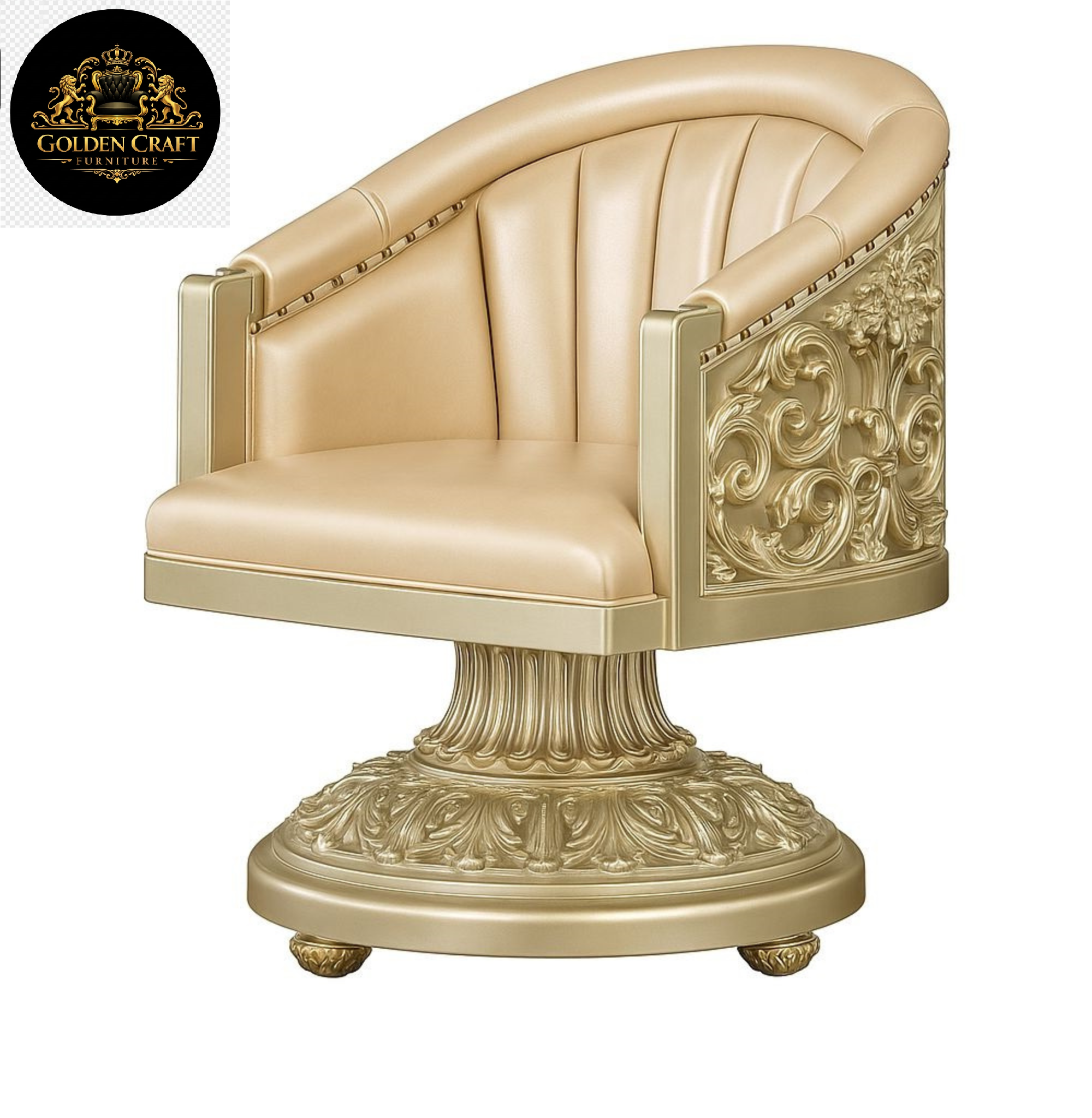 Designed in a classic European royal style, this set features a rectangular table with a durable, thick glass top and a heavily carved architectural pedestal base. The centerpiece is complemented by six barrel-style swivel chairs, each featuring intricate, all-around hand-carved detailing and premium upholstered seating for high-end comfort.The entire set is finished with rich gold leafing and Baroque-inspired leaf motifs, emphasizing its grand, sculptural craftsmanship. This set is often used to create a regal and refined atmosphere in high-end dining rooms or hotels.