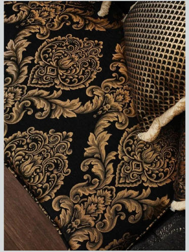 - Sofas & Armchairs: These pieces feature solid wood frames with elaborate hand-carved gold detailing. The upholstery is a dark fabric, often polyester or premium blends, decorated with elegant patterns and accompanied by numerous decorative pillows.