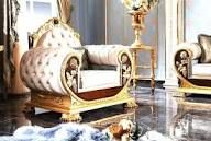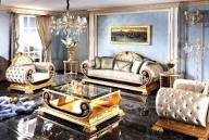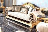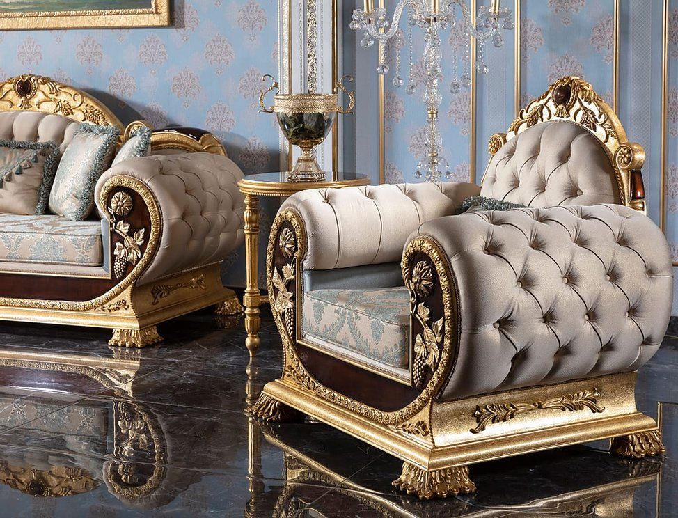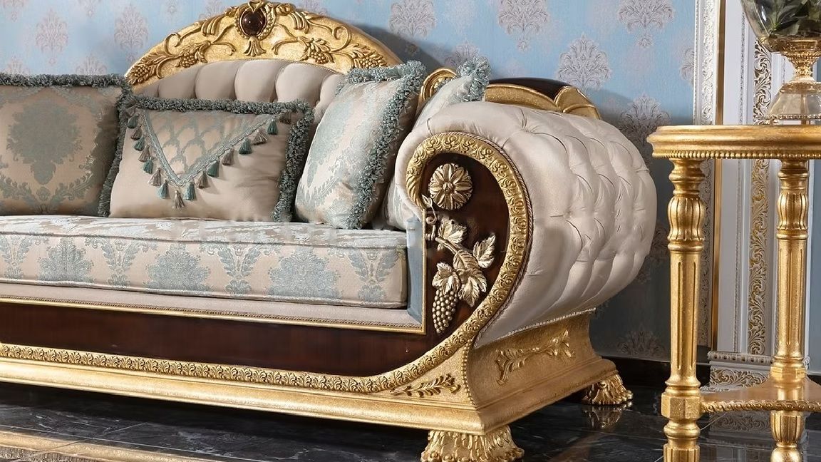 - Seating: The set includes deep-tufted sofas and armchairs with “WOW” factor upgrades, often featuring intricate scrollwork on the frames and premium velvet or silk upholstery.